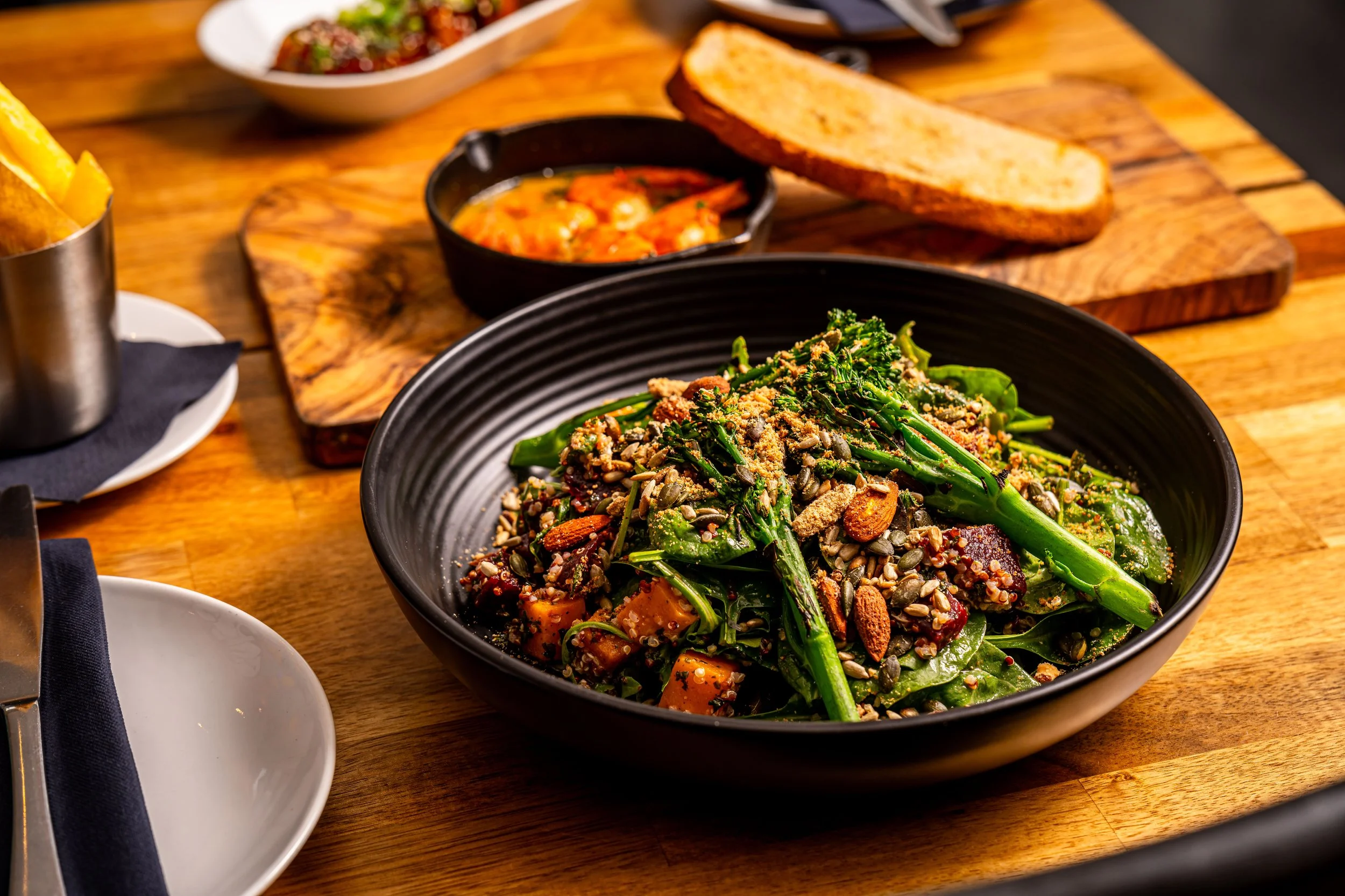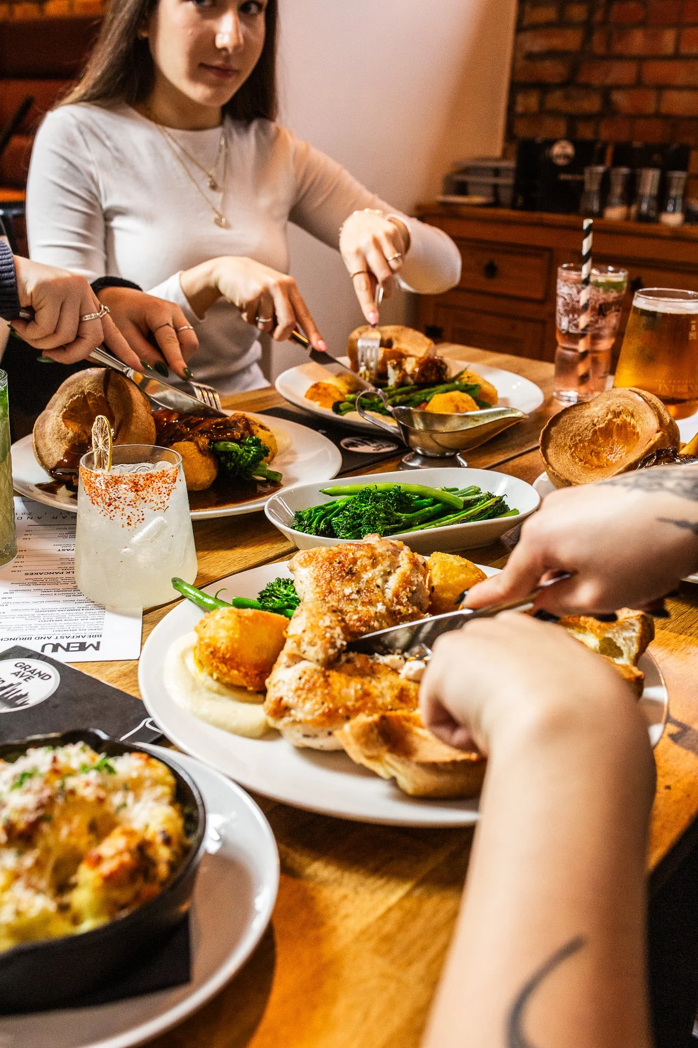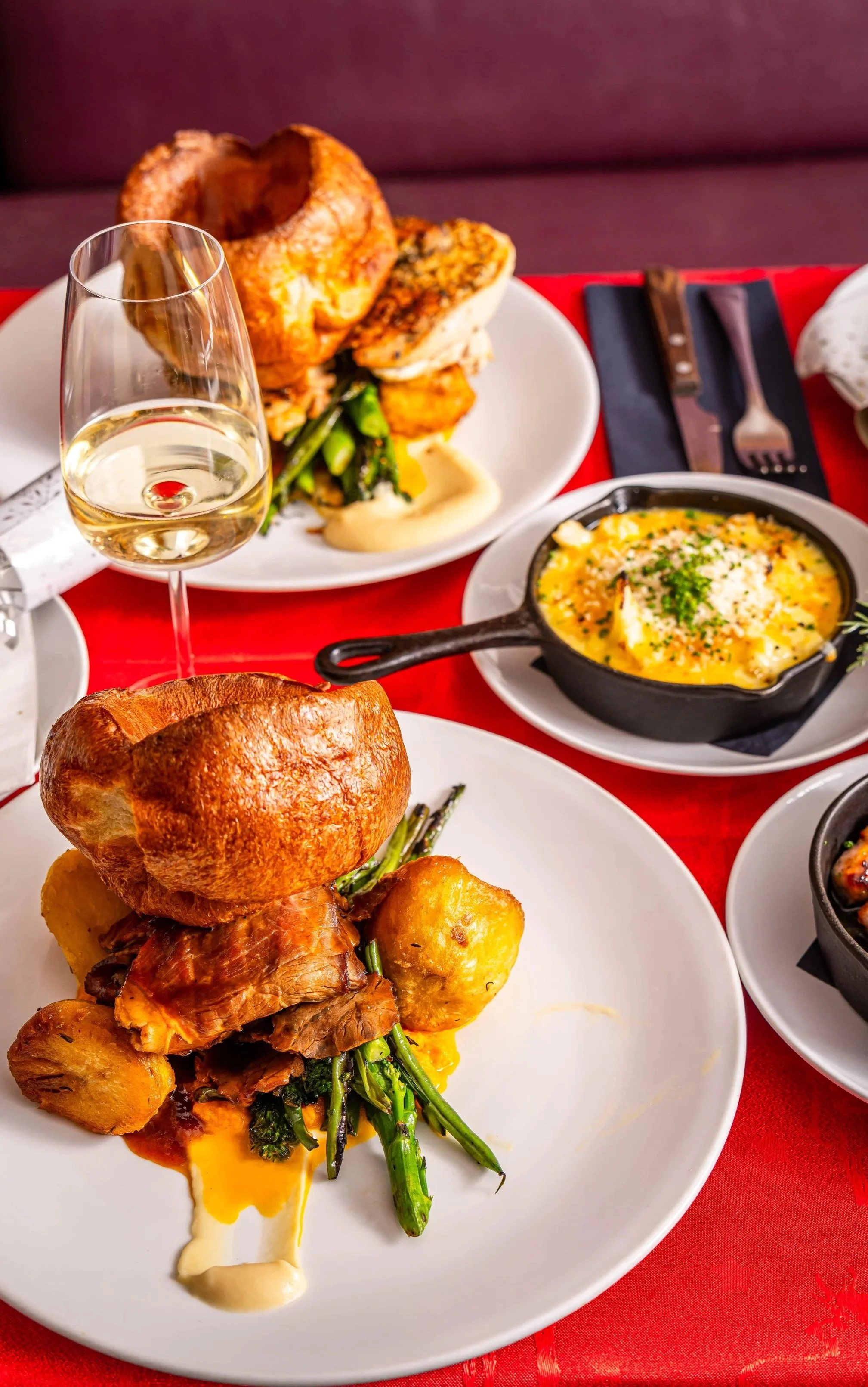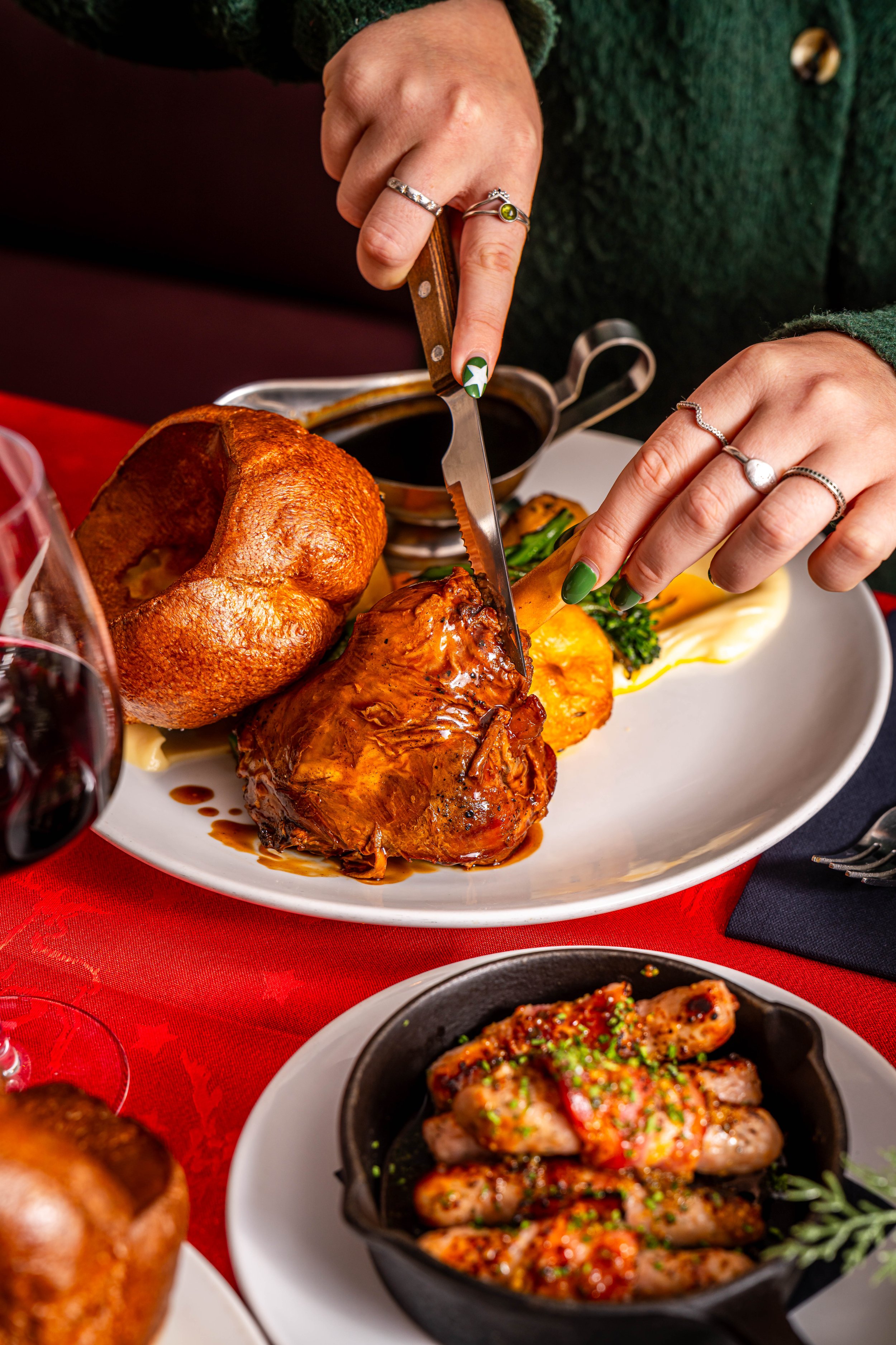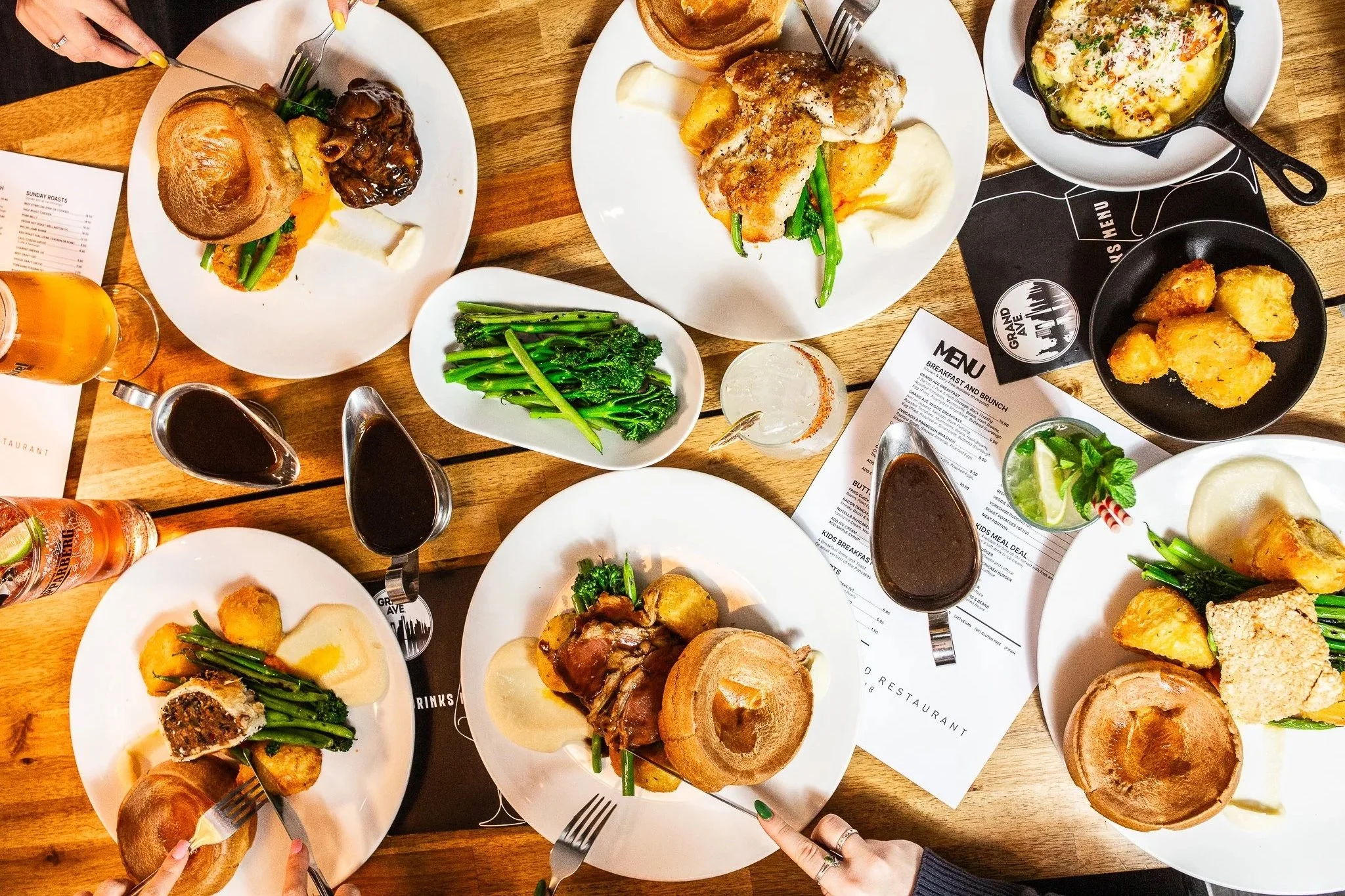 Roasts include chicken, nut roast, lamb and pork. They are also served with all the trimmings …and more!