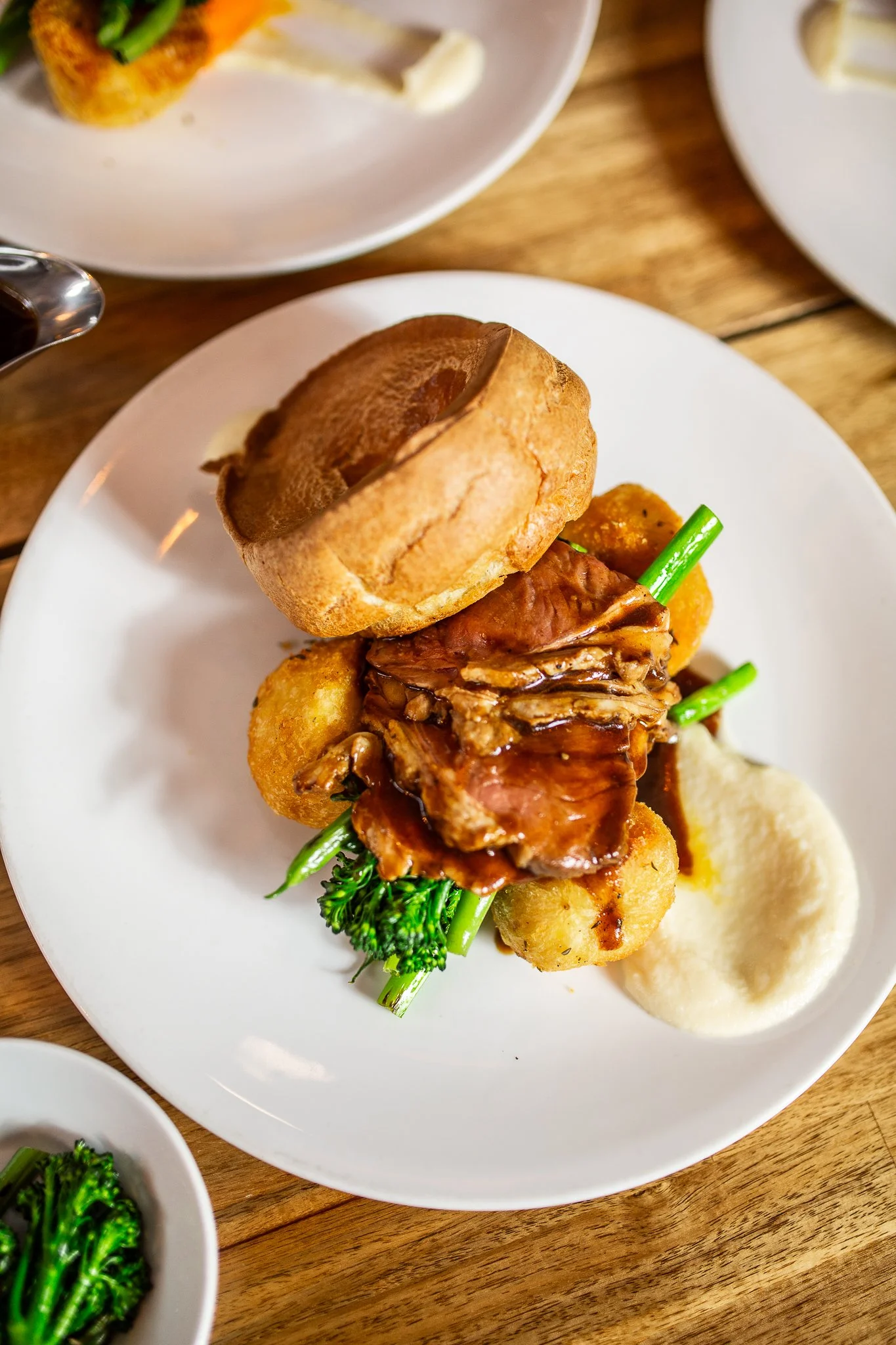 Roasts include chicken, nut roast, lamb, beef and pork. They are also served with all the trimmings …and more!